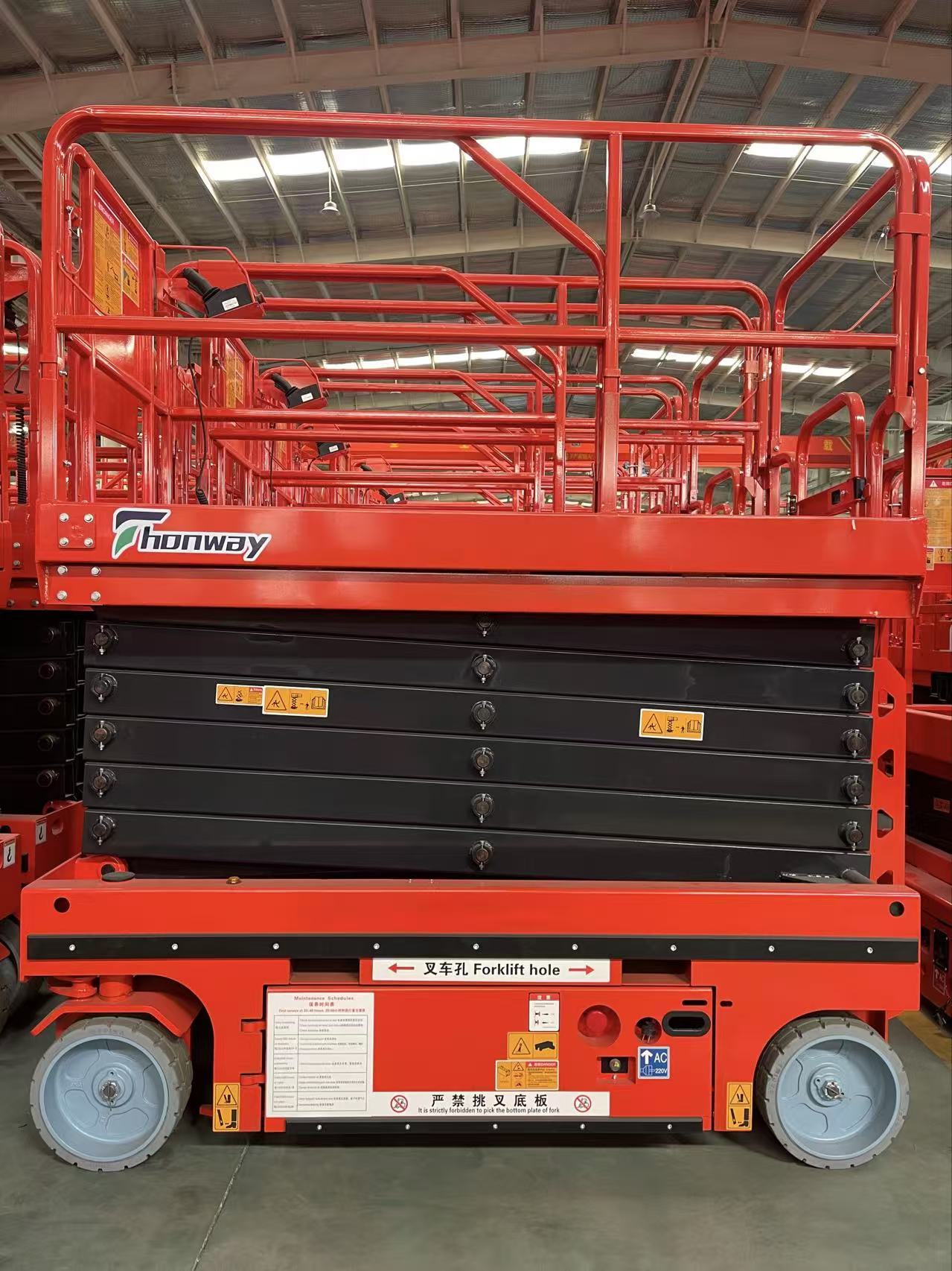 The self-propelled scissor lifting platform has an automatic walking function, and the whole machine is designed as a whole, which can operate flexibly in a small space. Built-in battery power supply, hydraulic drive and battery power combined, strong power, low noise, to meet different working states, no need for external power supply, no need for external traction can be lifted and lowered freely, the operator only needs to master the equipment control handle to complete the equipment forward, backward, steering, fast, slow walking and lifting and other actions. This equipment is flexible in movement, easy to operate, labor-saving, labor-saving to make high-altitude work more convenient and fast, is the ideal aerial work platform for efficient and safe production of modern enterprises, the tires are polyurethane non-marking tires, which are not easy to scratch the floor when used in high-end shopping malls. The battery is a lead-acid maintenance-free battery, with a large capacity to increase the use time of the equipment, strong power and strong endurance. The equipment is made of high-quality thickened steel to increase the support strength of the equipment, and comes with an overload protection system, tilt protection system, and pothole protection system, making the equipment safer and more reliable during use. The equipment is equipped with an upper and lower control system, and the upper control can operate the equipment to lift, walk, and steer. People can also operate the equipment to lift while standing on the ground. The equipment is also equipped with maintenance support to increase safety protection during maintenance. The paint surface adopts electrophoresis technology, and the coating of electrophoretic paint can make the inner cavity, weld, edge of the workpiece and other weak parts of the traditional coating method can also get good coating protection, so that the overall corrosion resistance of the product is significantly improved, and it is not easy to fade for a long time, which can greatly extend the service life of the product and improve the product grade.