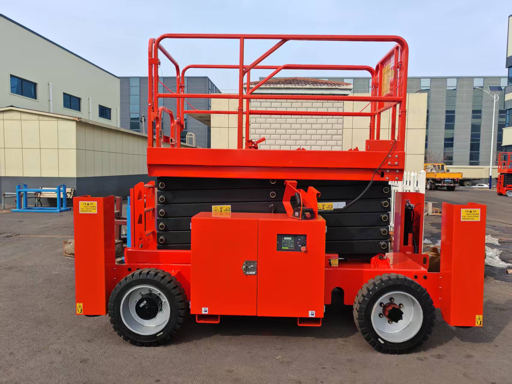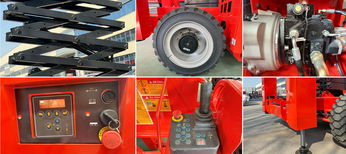 The off-road scissor lift is powered by diesel engines or electricity. It is equipped with high-power travel and lifting motors for strong performance. It features solid off-road tires with superior terrain-crossing capability, overcoming complex landscapes like mountains, mud, and deserts. The battery voltage warning function ensures battery longevity. With high load capacity for materials and personnel, it includes one-button leveling outriggers for stable operation on slopes, suitable for indoor and outdoor aerial work in rugged environments. Energy-efficient, eco-friendly, and low-noise, this self-propelled off-road lift platform offers flexible operation, safety, and reliability. Its extendable deck quickly reaches workspaces, while foldable guardrails reduce transport size. The product is safe, user-friendly, intelligent, efficient, and durable.