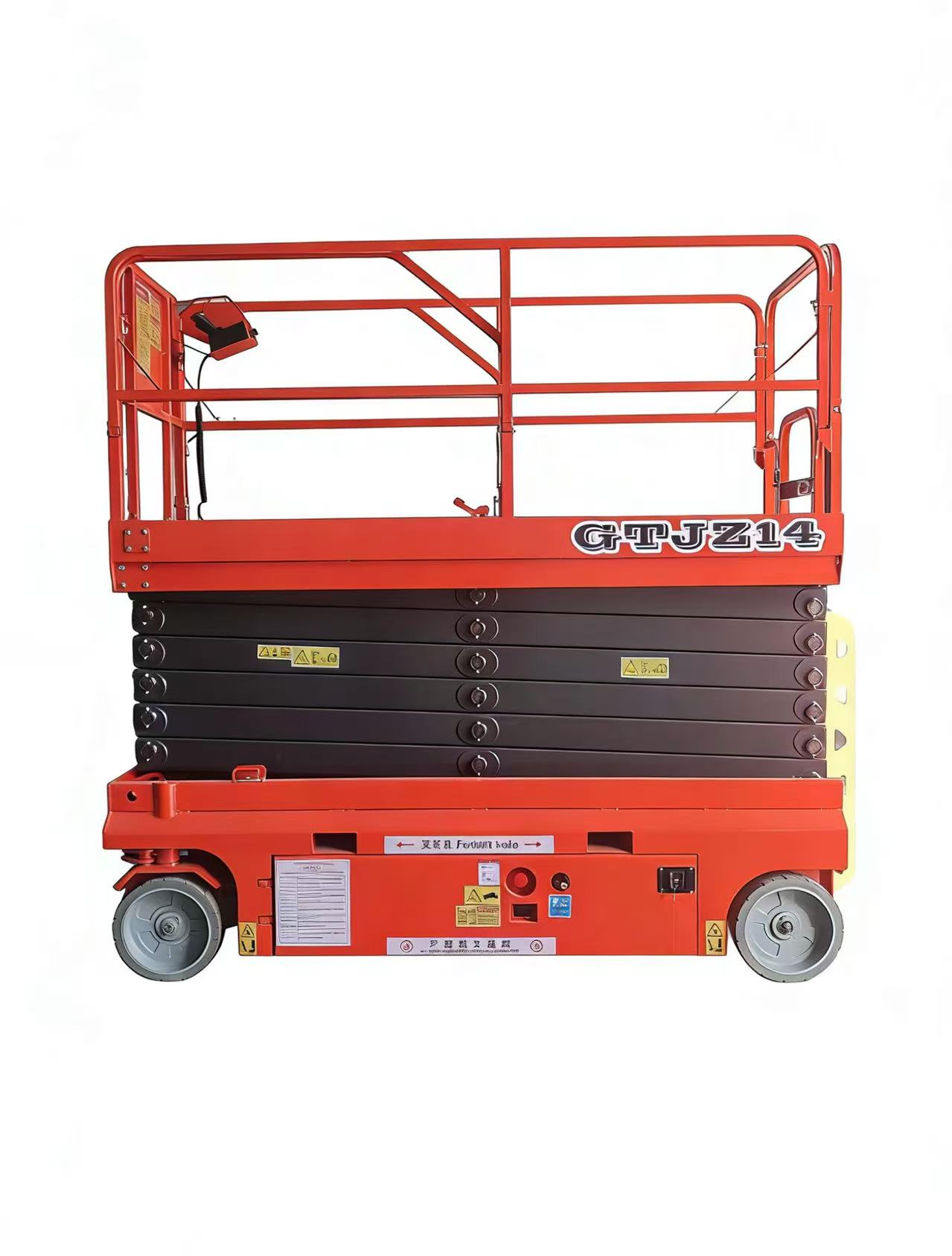 The self-propelled scissor lifting platform has an automatic walking function, and the whole machine is designed as a whole, which can operate flexibly in a small space. Built-in battery power supply, hydraulic drive and battery power combined, strong power, low noise, to meet different working states, no need for external power supply, no need for external traction can be lifted and lowered freely, the operator only needs to master the equipment control handle to complete the equipment forward, backward, steering, fast, slow walking and lifting and other actions. This equipment is flexible in movement, easy to operate, labor-saving, labor-saving to make high-altitude work more convenient and fast, is the ideal aerial work platform for efficient and safe production of modern enterprises, the tires are polyurethane non-marking tires, which are not easy to scratch the floor when used in high-end shopping malls. The battery is a lead-acid maintenance-free battery, with a large capacity to increase the use time of the equipment, strong power and strong endurance. The equipment is made of high-quality thickened steel to increase the support strength of the equipment, and comes with an overload protection system, tilt protection system, and pothole protection system, making the equipment safer and more reliable during use. The equipment is equipped with an upper and lower control system, and the upper control can operate the equipment to lift, walk, and steer. People can also operate the equipment to lift while standing on the ground. The equipment is also equipped with maintenance support to increase safety protection during maintenance. The paint surface adopts electrophoresis technology, and the coating of electrophoretic paint can make the inner cavity, weld, edge of the workpiece and other weak parts of the traditional coating method can also get good coating protection, so that the overall corrosion resistance of the product is significantly improved, and it is not easy to fade for a long time, which can greatly extend the service life of the product and improve the product grade.