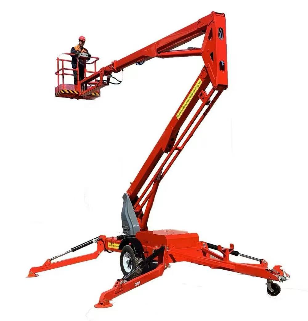 The towable articulated boom lift features a compact arm structure, quick setup, automatic hydraulic outriggers, and simple, convenient operation. Constructed with high-quality new steel, it offers high strength, lightweight design, easy transport, and quick towing capability with a maximum travel speed of 90 km/h. The platform combines elevation with large horizontal extension, rotates for multi-point operation from a single setup, significantly boosting efficiency. Equipped with one-touch auto-leveling, effortless deployment, and safe construction, it is the ideal tool for maintenance, welding, installation, construction, pruning, and other aerial tasks.