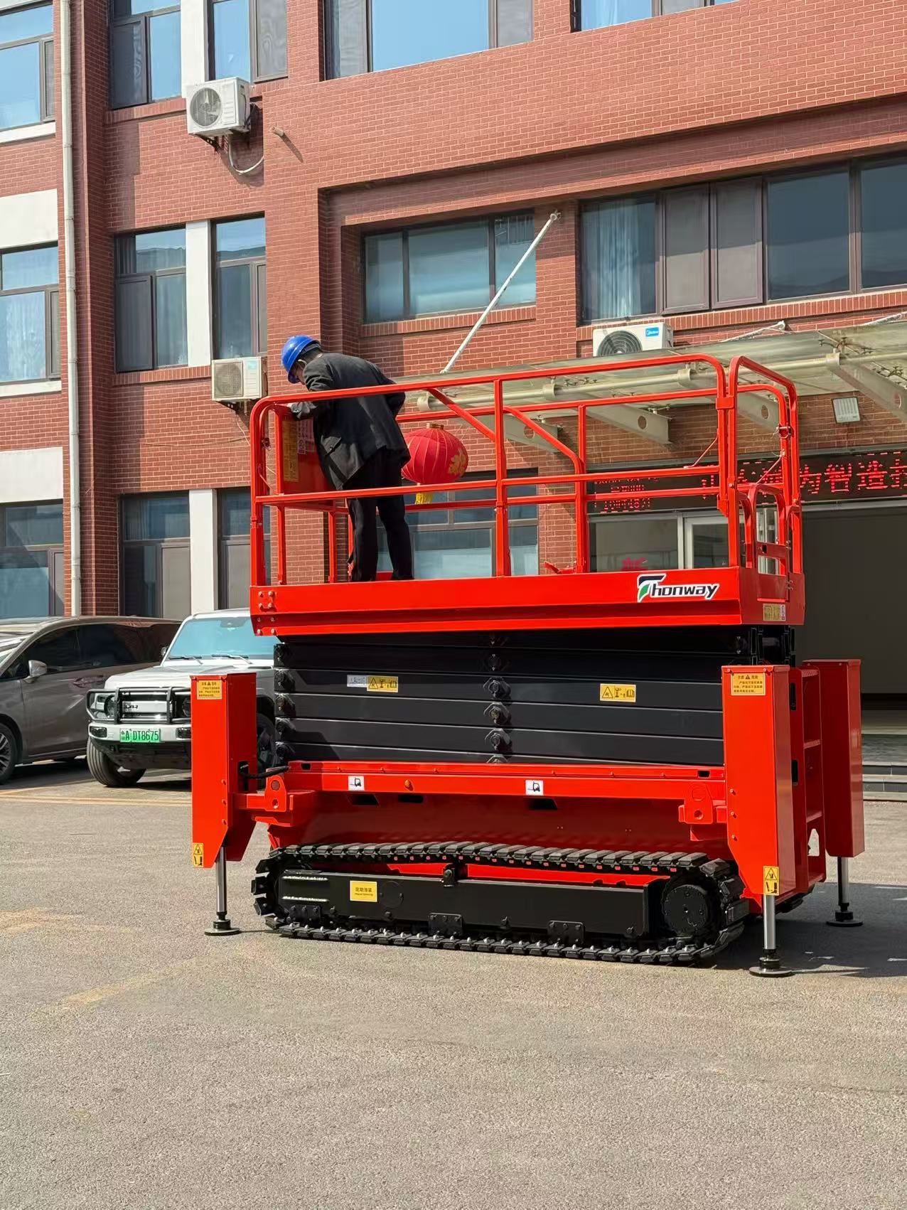 Designed for rugged outdoor terrains and complex construction environments, this crawler-type electric hydraulic lift excels in adaptability, operating efficiently in off-grid or challenging conditions. It features built-in maintenance-free lead-acid batteries, eliminating the need for external power and enabling effortless slope climbing.  Constructed from premium thickened steel for enhanced structural strength, the platform includes overload and tilt protection systems for added safety and reliability. Dual controls (upper and lower) allow operators to manage lifting, movement, and steering from the platform.  The electroplated paint finish employs electrophoresis technology, ensuring uniform coating coverage—including hard-to-reach areas like inner cavities, welds, and edges—significantly boosting corrosion resistance. This durable, fade-resistant finish extends product lifespan and elevates its premium quality.